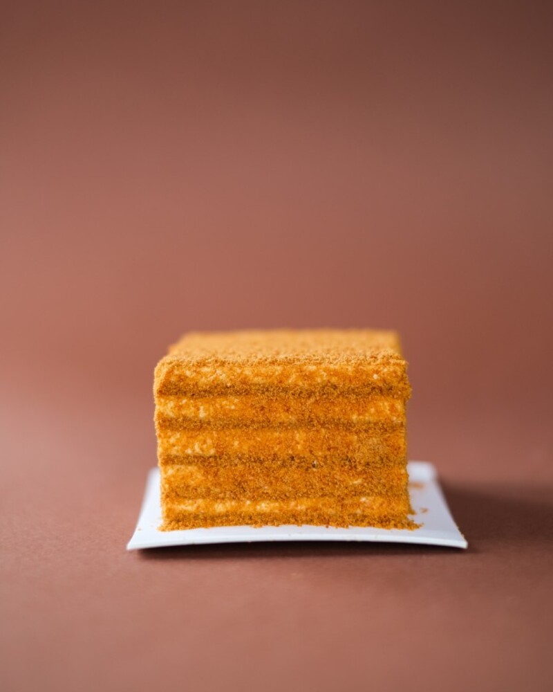 Тончайшие карамельно-медовые коржи и сметанный крем.