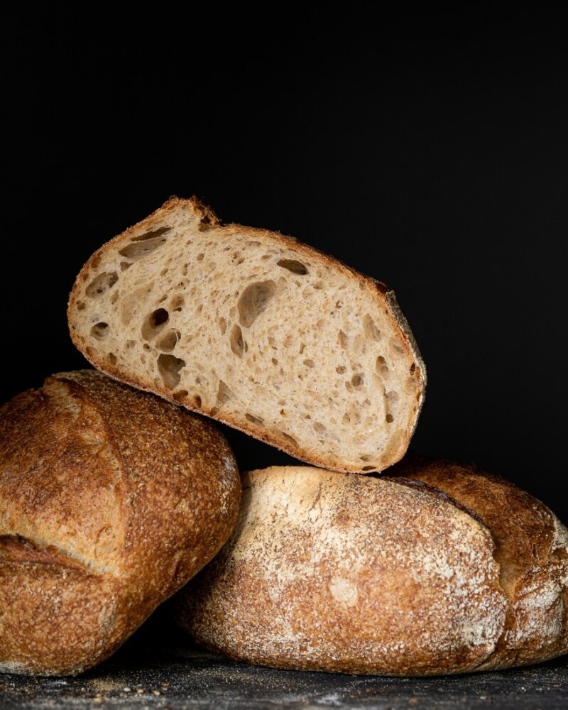 Пшенично-ржаной хлеб длительного брожения со свежесмолотой цельнозерновой ржаной и пшеничной мукой на натуральной пшеничной закваске без добавления промышленных дрожжей.