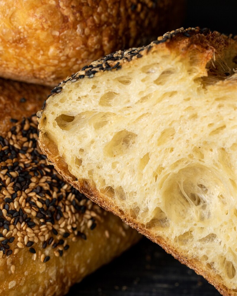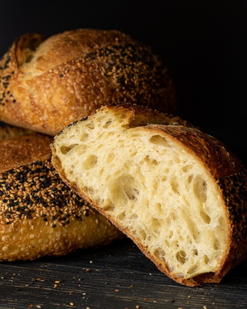Пшеничный хлеб длительного брожения с семенами кунжута, с мукой их твердых сортов пшеницы Semola производства итальянской фабрики на натуральной закваске без добавления промышленных дрожжей.