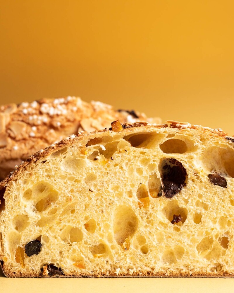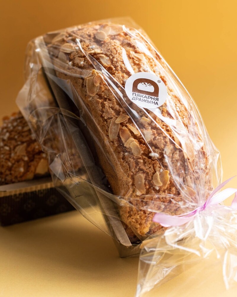 мука пшеничная высший сорт, сухофрукты (изюм, апельсин) масло сладкосливочное несоленое 84% (сливки пастеризованные из коровьего молока), желток куриного яйца, шоколад темный 54,5% Barry Callebaut, пудра сахарная, сахар, миндаль ядра, миндаль лепестки, цедра апельсина, цедра лимона, мед, вода, ром темный, ваниль стручковая.